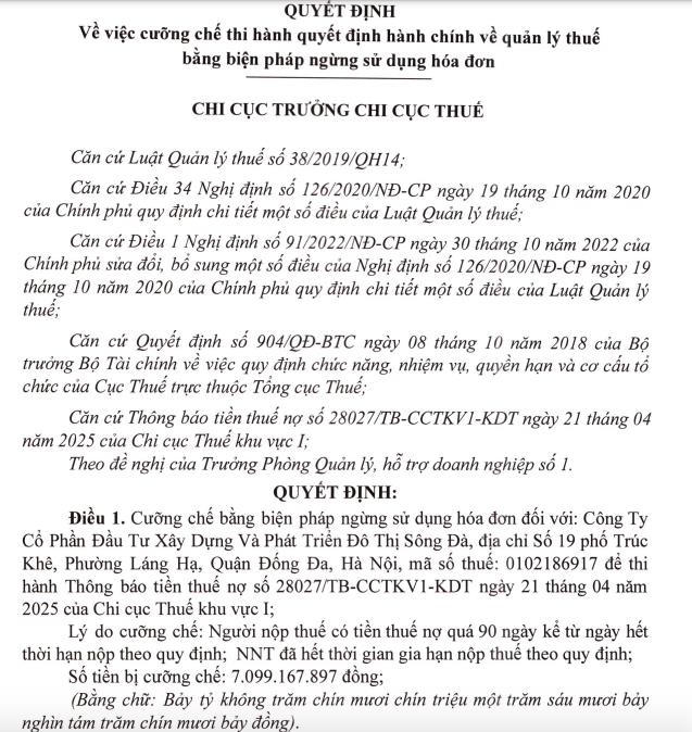 CTCP Đầu tư Xây dựng và Phát triển Đô thị Sông Đà (mã ck: SDU) vừa nhận quyết định về việc cưỡng chế thuế bằng biện pháp ngừng sử dụng hóa đơn từ Chi cục Thuế khu vực I.