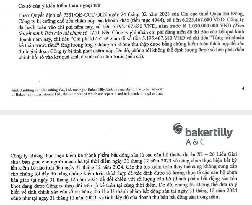 Bên cạnh vấn đề thuế, kiểm toán viên cũng đưa ra một loạt ý kiến ngoại trừ khác đáng chú ý. Đó là công ty không kiểm kê tồn kho bất động sản là các căn hộ thuộc dự án X1-26 Liễu Giai tại cả 2 thời điểm 31/12/2023 và 31/12/2024. Kiểm toán không thể xác nhận số lượng căn hộ tồn kho cũng như tính đầy đủ doanh thu bán bất động sản.