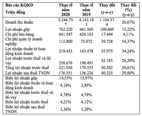 Biên lợi nhuận gộp năm 2020 tuy thấp hơn so với 2019 (14,53% so với 15,97%) nhưng biên lợi nhuận thuần và biên lợi nhuận sau thuế đều tăng so với năm 2019.