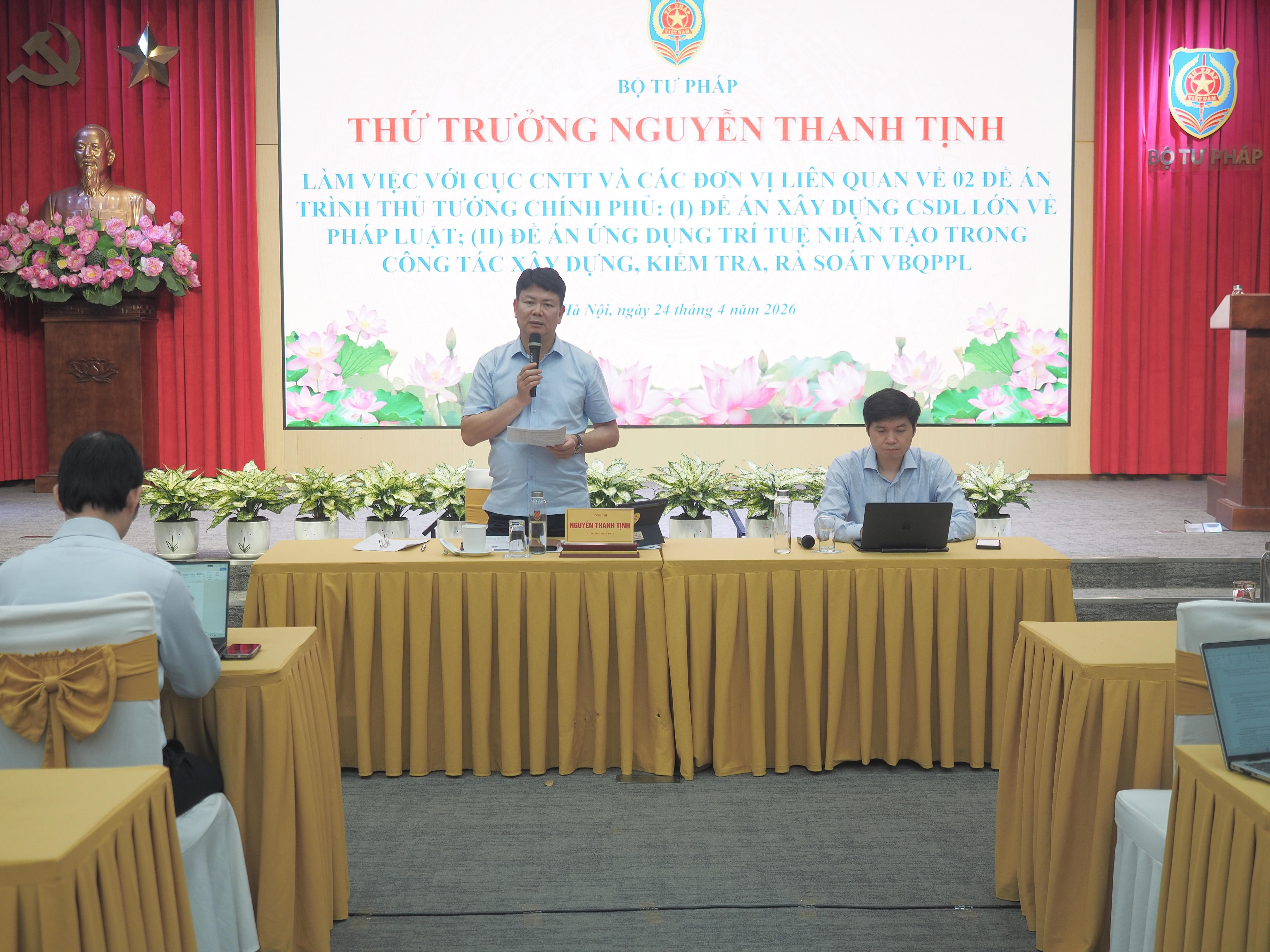 Ngày 24/4, kết luận buổi làm việc với Cục Công nghệ thông tin và các đơn vị liên quan về Đề án xây dựng cơ sở dữ liệu (CSDL) lớn về pháp luật và Đề án ứng dụng trí tuệ nhân tạo trong công tác xây dựng, kiểm tra, rà soát văn bản quy phạm pháp luật (VBQPPL), Thứ trưởng Nguyễn Thanh Tịnh nhấn mạnh đây đều là những nhiệm vụ trọng tâm, có tính chất phức tạp, phạm vi rộng và yêu cầu rất cao, cần được hoàn thiện khẩn trương để kịp trình Chính phủ trong thời gian tới.