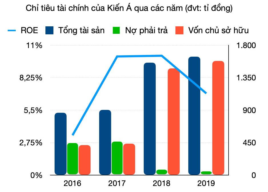 Về quy mô tài sản, cuối năm 2019 tổng tài sản của Kiến Á đạt 1.643 tỉ đồng, trong đó vốn chủ sở hữu là 1.584 tỉ đồng còn nợ phải trả khoảng 60 tỉ đồng. Năm 2018 và 2019, nợ phải trả của Kiến Á giảm mạnh so với mức trên 450 tỉ đồng của hai năm trước đó.