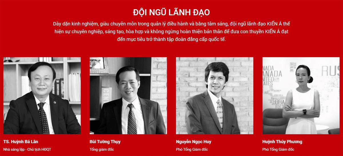 Ông Huỳnh Bá Lân sinh năm 1956, là nhà sáng lập kiêm Chủ tịch HĐQT của Kiến Á. Ông Bùi Tường Thuỵ - Chủ tịch của Sài Gòn Nam Phú nắm giữ vị trí Tổng giám đốc của Kiến Á hàng chục năm qua. Bà Huỳnh Thuý Phương là con gái của ông Huỳnh Bá Lân đang giữ vị trí Phó Tổng giám đốc của Kiến Á.