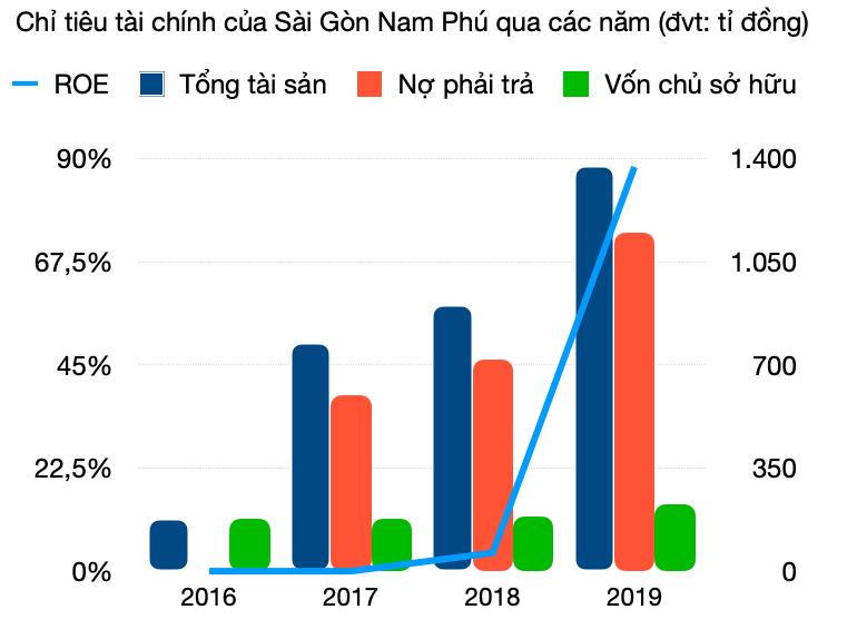 Nếu năm 2016, Sài Gòn Nam Phú không phát sinh nợ phải trả thì giai đoạn 2017 - 2019, chỉ tiêu này tăng vọt và cán mốc 1.150 tỉ đồng hết năm 2019. Nợ phải trả cuối năm 2019 đã gấp 5 lần vốn chủ sở hữu.