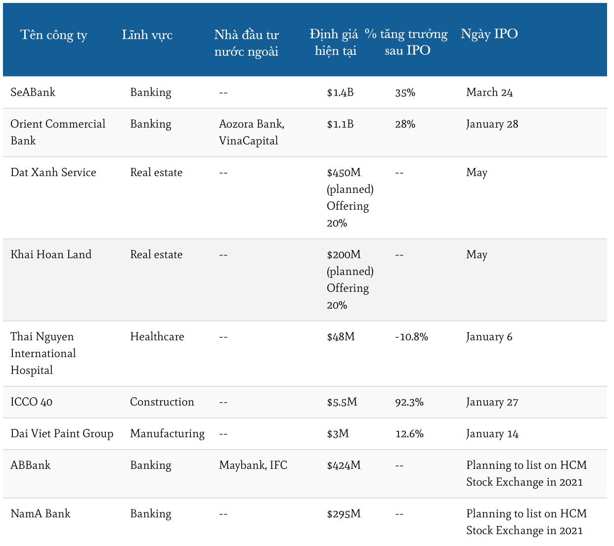 Deal Street Asia đưa tin, thị trường IPO (phát hành lần đầu ra công chúng) ở Việt Nam đang bắt đầu sôi động trở lại vào năm 2021 khi đại dịch giảm bớt và một số nút thắt liên quan đến chế tài quản lý sớm được gỡ bỏ. Làn sóng mới này dự báo sẽ đánh dấu sự kết thúc hai năm tạm lắng của thị trường IPO tại Việt Nam.
