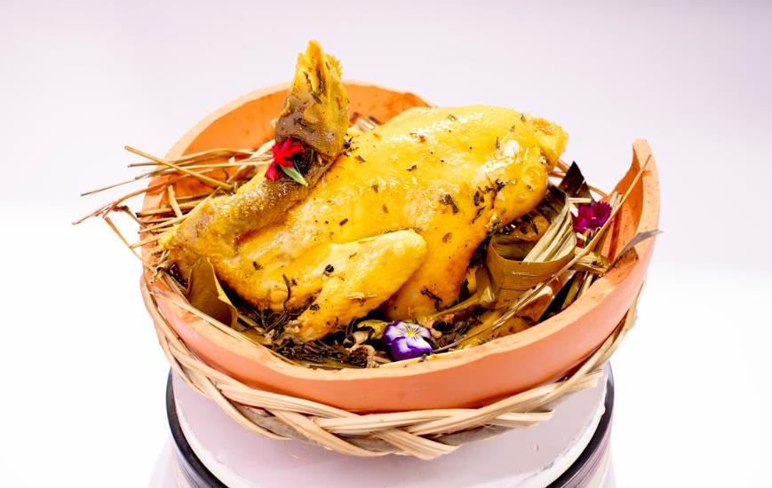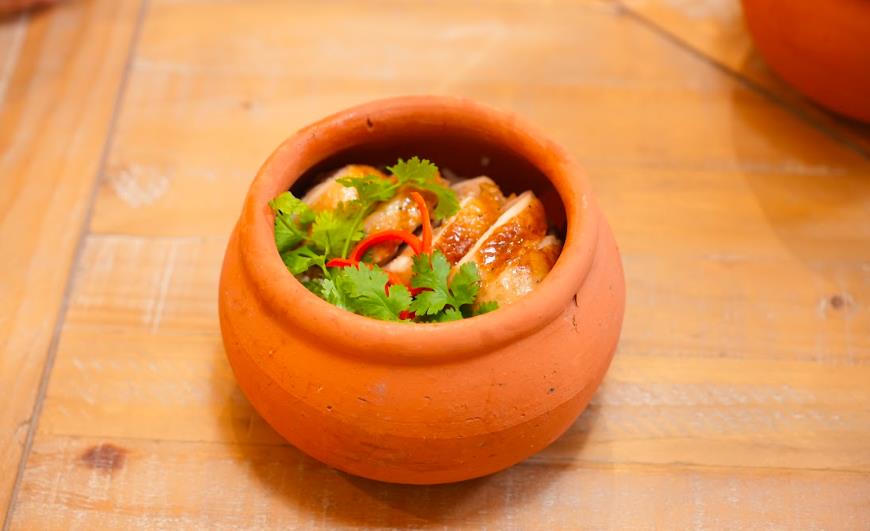 Dùng phương pháp xông hơi gà trong niêu, dùng nhiệt tác động vào gà giúp cho thịt gà chín mềm nhưng vẫn giữ được độ giòn, độ ngọt của gà. Thời gian xông gà khoảng 1 tiếng, chỉ dùng nhiệt tác động vào các nguyên liệu, hoàn toàn không dùng nước. Món này ăn kèm xôi, phần xôi Chef Ryan cho biết sử dụng mỡ gà để nấu kèm, có thêm nước cốt dừa và lá dứa để phần xôi thêm béo thơm.