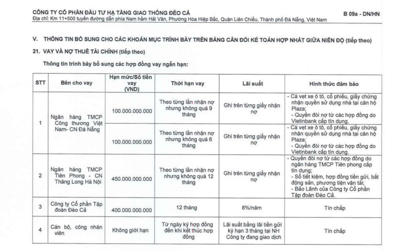Trong số này, chỉ riêng chi nhánh Hà Nội một ngân hàng đã tài trợ cho Đèo Cả hơn 19.000 tỷ đồng, chủ yếu là các khoản vay dài hạn 3-5 năm. Theo thuyết minh Báo cáo tài chính, tổng hạn mức của nhà băng này cấp cho Đèo Cả là hơn 22.000 tỷ đồng, với nhiều hợp đồng vay có thời hạn dài từ 15 đến 26 năm.