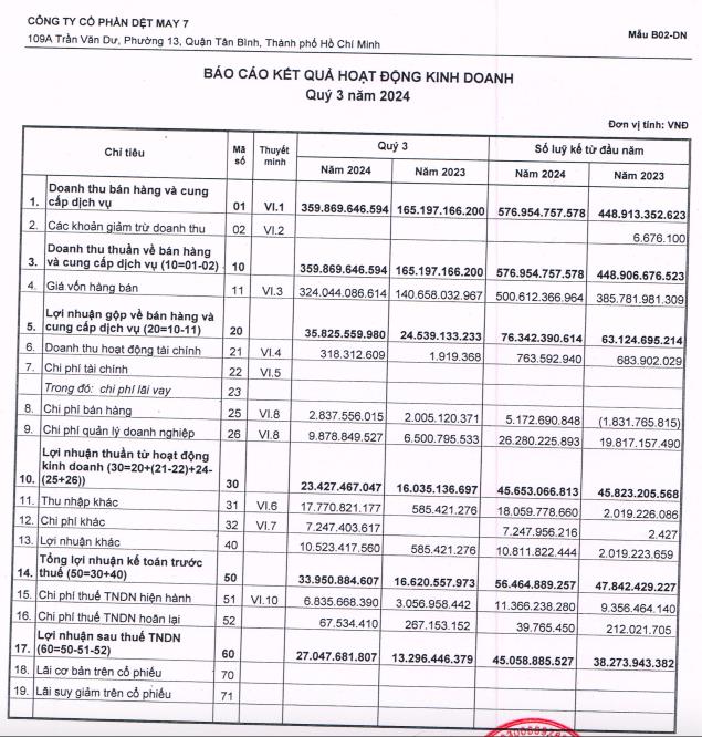 Khấu trừ chi phí, giá vốn, DM7 báo lãi sau thuế đạt 27 tỷ đồng, tăng 103% so với cùng kỳ. Theo giải trình từ DM7, lợi nhuận của doanh nghiệp tăng cao do sản lượng sản xuất và tiêu thụ của công ty tăng mạnh nhờ tập trung sản xuất và tiêu thụ đơn hàng lớn.