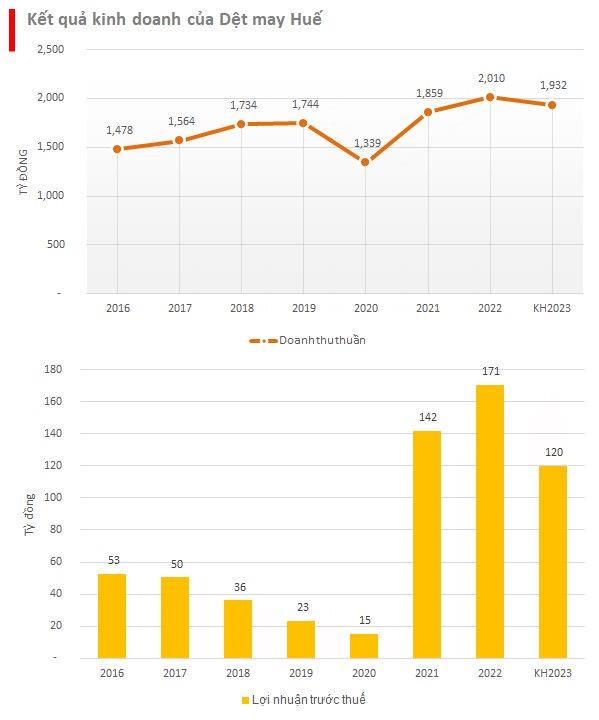 Năm 2022, kết quả kinh doanh của Huegatex lập đỉnh mới với doanh thu thuần vượt 2.000 tỷ đồng và lợi nhuận trước thuế đạt 171 tỷ đồng. Năm 2023, công ty đặt kế hoạch tổng doanh thu 1.932 tỷ và lợi nhuận 120 tỷ đồng. Tỷ lệ cổ tức dự kiến 30%.