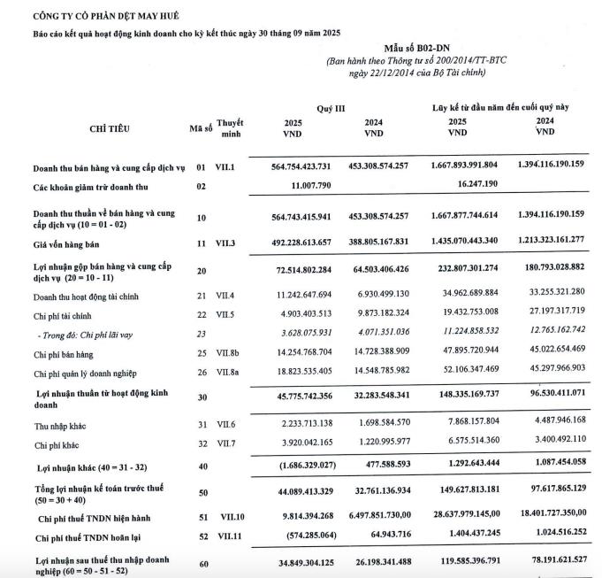 CTCP Dệt may Huế (Huegatex, mã ck: HDM) vừa công bố báo cáo tài chính quý III/2025 và 9 tháng đầu năm.