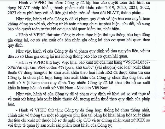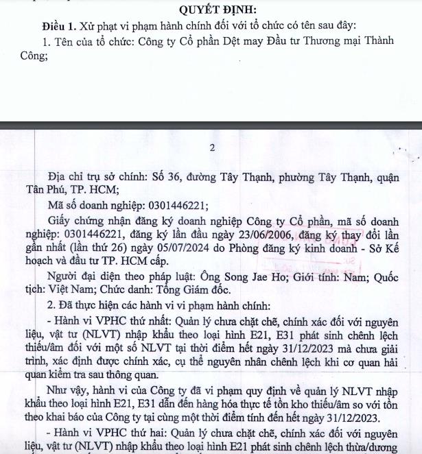 Thứ nhất, Dệt may Thành Công đã có hành vi quản lý chưa chặt chẽ, chính xác đối với nguyên liệu, vật tư nhập khẩu theo loại hình E21, E31 phát sinh chênh lệch thiếu/âm đối với một số nguyên liệu, vật tư tại thời điểm hết ngày 31/12/2023 mà chưa giải trình, xác định được chính xác, cụ thể nguyên nhân chênh lệch khi cơ quan hải quan kiểm tra sau thông quan.