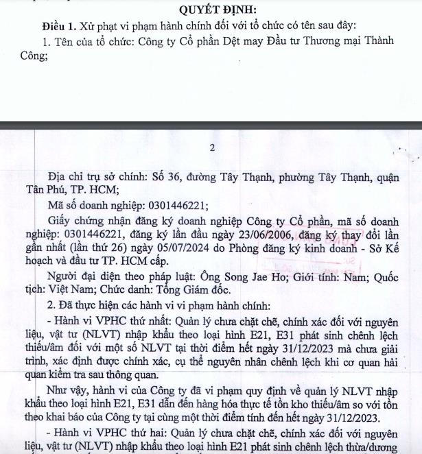 Căn cứ kết quả kiểm tra sau thông quan giai đoạn tháng 7/2019 đến tháng 6/2024, Cục Kiểm tra sau thông quan - Tổng cục Hải quan vừa ra quyết định xử phạt vi phạm hành chính pháp luật về thuế với Công ty Cổ phần Dệt may - Đầu tư - Thương mại Thành Công (mã ck: TCM). Công ty có địa chỉ tại 36 Tây Thạnh, phường Tân Thạnh, quận Tân Phú, TPHCM.