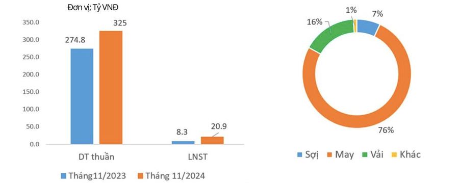 Tính riêng tháng 11/2024, doanh thu Dệt may Thành Công đạt 325 tỷ đồng và lãi sau thuế 20,9 tỷ đồng, tăng 18% và 151% so với cùng kỳ năm 2023. Trong đó, doanh thu chủ yếu từ sản phẩm may (76%), kế đến là vải (16%) và sợi (7%).