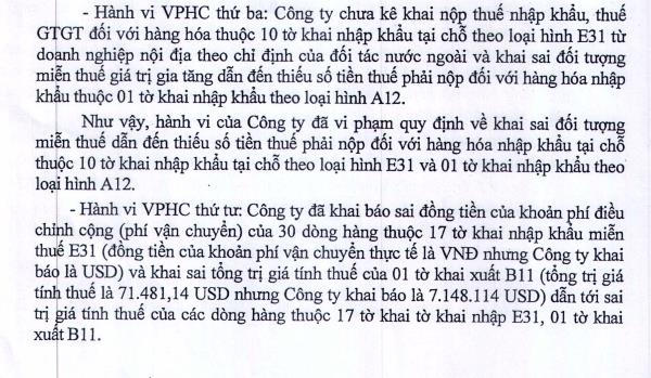Thứ tư, Công ty đã khai báo sai đồng tiền của khoản phí điều chỉnh cộng (phí vận chuyển) của 30 dòng hàng thuộc 17 tờ khai nhập khẩu miễn thuế E31 (đồng tiền của khoản phí vận chuyển thực tế là VND nhưng khai báo là USD) và khai sai tổng giá tính thuế của 1 tờ khai B11 (tổng giá tính thuế là 71.481,14 USD nhưng khai báo là 7.148.114 USD) dẫn tới sai trị giá tính thuế của các dòng hàng thuộc 17 tờ khai nhập E31, 1 tờ khai xuất B11.