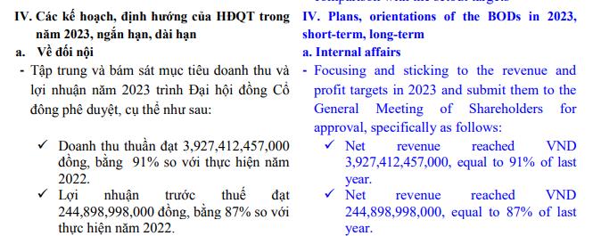 Năm nay, công ty đặt mục tiêu doanh thu thuần đạt 3.927 tỷ đồng và lợi nhuận trước thuế đạt 245 tỷ đồng, giảm lần lượt 9%, 30% so với cùng kỳ. Mức cổ tức năm 2023 dự kiến là 15%.