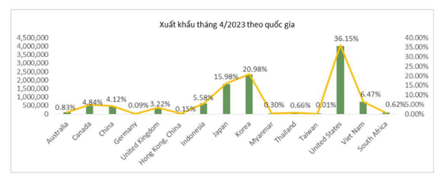 Xét trong tháng 4/2023, TCM xuất khẩu sang thị trường Châu Á chiếm 54,3% trong đó thị trường Hàn Quốc chiếm 20,98%, thị trường Nhật chiếm 15,98%, Trung Quốc chiếm 4,12%. Tiếp đến là thị trường Châu Mỹ chiếm 41% trong đó thị trường Mỹ chiếm 36,15%, Canada chiếm 4,84%; thị trường Châu Âu chiếm 3,3%.