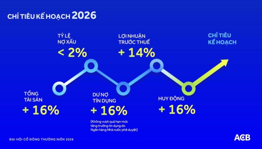 Đại hội cũng thông qua kế hoạch lợi nhuận năm 2026 ở mức 22.338 tỷ đồng. Theo đó, ACB tiếp tục theo đuổi định hướng tăng trưởng thận trọng, gắn với chất lượng tài sản, an toàn vốn và hiệu quả hoạt động trong bối cảnh môi trường kinh doanh còn nhiều biến số.