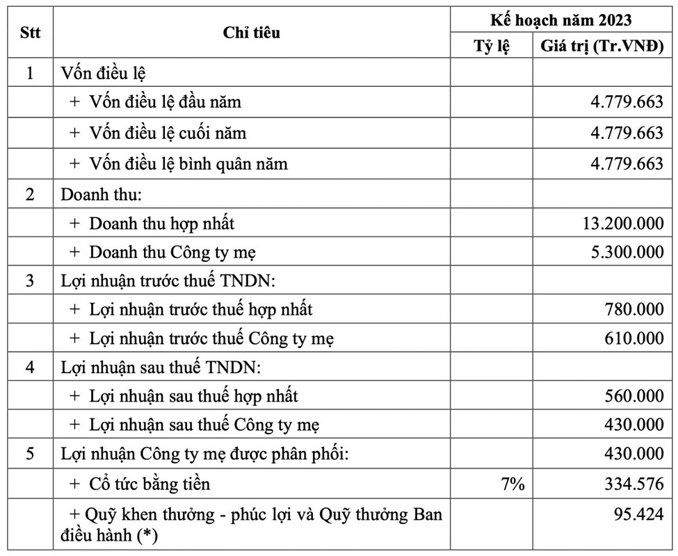 Theo đó, Doanh nghiệp đã đặt kế hoạch kinh doanh 2023 với doanh thu 13,2 ngàn tỷ đồng, giảm 19,4% so với thực hiện 2022. Chỉ tiêu lợi nhuận đặt ra giảm tới 42% so với thực hiện năm 2022 xuống còn 560 tỷ đồng.