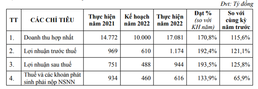 Mặc dù đứng trước những khó khăn của năm 2022, Công ty vẫn thu về kết quả đáng khích lệ khi doanh thu hợp nhất thực hiện năm 2022 là 17.081 tỷ đồng, đạt 170,8% kế hoạch năm 2022, tăng 15,6% so với thực hiện năm 2021; Lợi nhuận hợp nhất trước thuế thực hiện năm 2022 là 1.174 tỷ đồng, đạt 192,4% kế hoạch năm 2022, tăng 21,1% so với thực hiện năm 2021.
