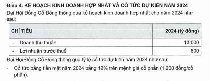Lợi nhuận trước thuế đạt 800 tỷ đồng, gấp 2,5 lần so với năm 2023. Cổ tức dự kiến đạt 12%/năm, tương đương mỗi cổ đông sở hữu 1 cổ phiếu nhận về 1.200 đồng.