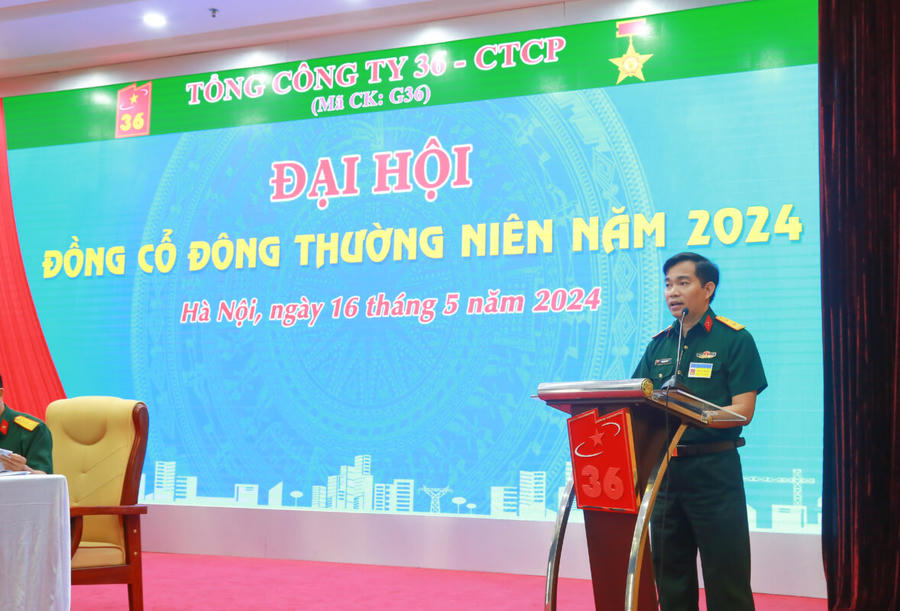 Sáng 16/5, Đại hội đồng cổ đông thường niên năm 2024 của Tổng công ty 36 – Công ty cổ phần (mã ck: G36) diễn ra tại trụ sở công ty ở số 141 Hồ Đắc Di, Nam Đồng, Hà Nội.