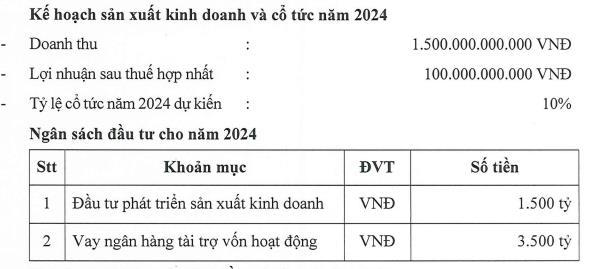 Ngân sách đầu tư cho năm 2024 dành cho đầu tư phát triển sản xuất kinh doanh là 1.500 tỷ đồng; công ty tính vay ngân hàng tài trợ vốn hoạt động 3.500 tỷ đồng.