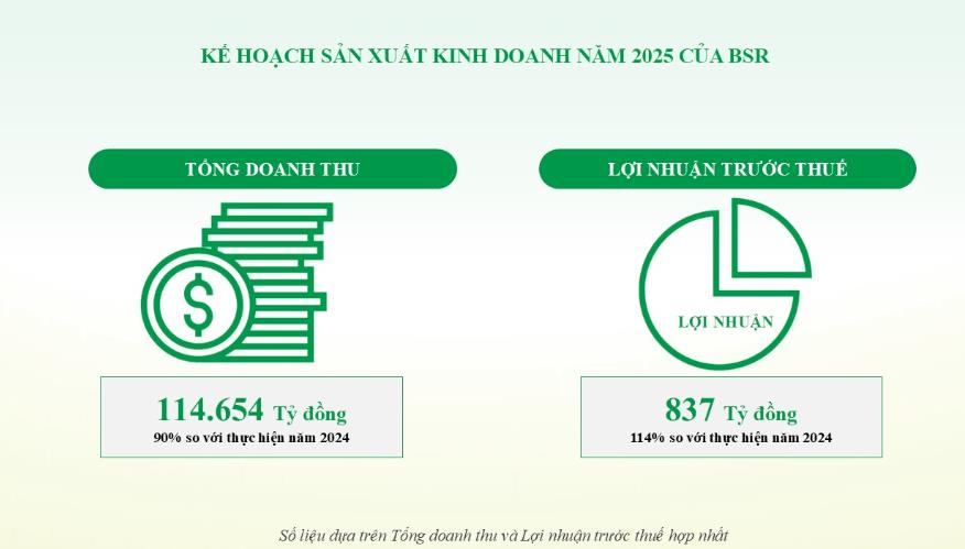 Theo kế hoạch năm 2025 đã được Đại hội đồng cổ đông phê duyệt, BSR đặt mục tiêu sản xuất 6,69 triệu tấn sản phẩm, với khả năng đạt tới 7,3 triệu tấn nếu điều kiện thuận lợi. Doanh thu hợp nhất dự kiến đạt 114.654 tỷ đồng, lợi nhuận sau thuế mục tiêu là 752 tỷ đồng và đóng góp ngân sách Nhà nước khoảng 13.004 tỷ đồng.