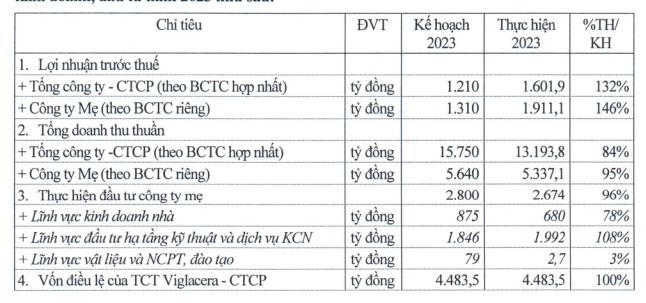 Tuy nhiên, với những nỗ lực của cả tập thể, kết thúc năm 2023, Viglacera ghi nhận tổng doanh thu thuần đạt 13.193 tỷ đồng, thực hiện đạt 84% kế hoạch năm. Lợi nhuận trưóc thuế VGC ghi nhận được tại 1.602 tỷ đồng, đạt 132% kế hoạch năm.