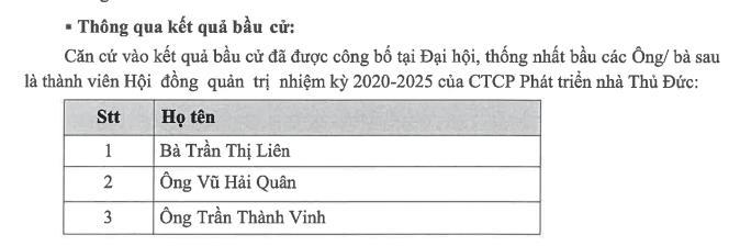 Theo đó, Đại hội đồng cổ đông của TDH thông qua bầu 3 cá nhân vào Hội đồng quản trị gồm: Tổng Giám đốc hiện tại bà Trần Thị Liên, ông Trần Thành Vinh và ông Vũ Hải Quân.