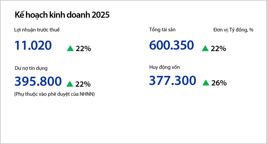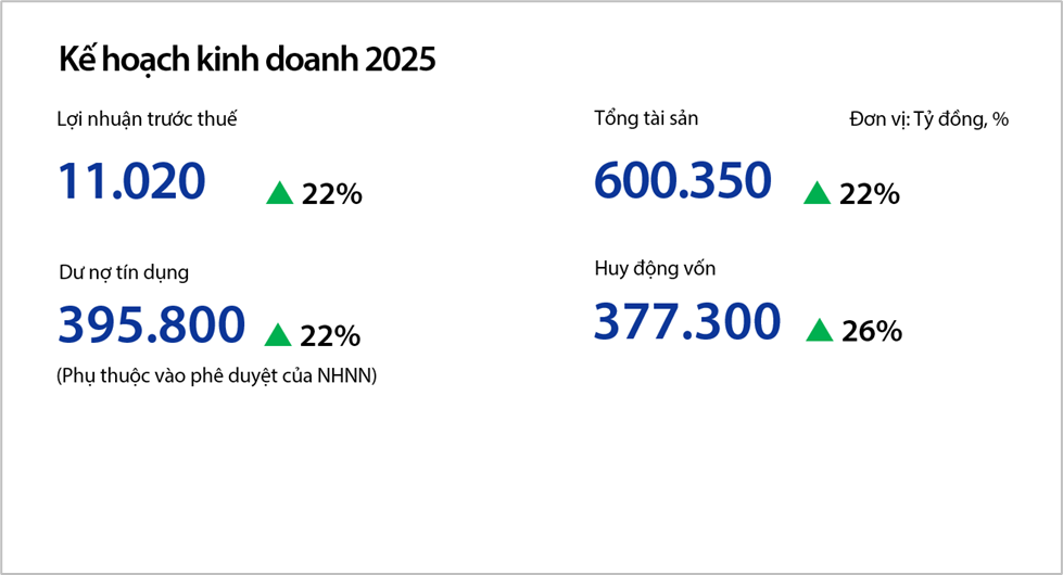 ĐHĐCĐ đã thông qua kế hoạch kinh doanh năm 2025 do HĐQT đề xuất, bao gồm tăng trưởng tổng tài sản, dư nợ, huy động vốn và lợi nhuận. Trong đó, mức tăng trưởng dư nợ tín dụng có thể được điều chỉnh tùy thuộc vào hạn mức cho phép của NHNN.