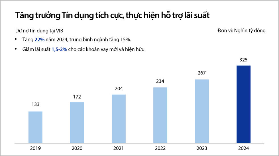 Theo ban lãnh đạo VIB chia sẻ, năm 2024 VIB đạt mức tăng trưởng tín dụng gần 22%, gấp 1,5 lần so với trung bình ngành. Tuy nhiên lợi nhuận ngân hàng giảm 16% là do VIB chấp nhận hy sinh lợi ích ngắn hạn để đầu tư cho lợi ích dài hạn cho các khách hàng và cổ đông, thông qua 4 nhóm hành động bao gồm: Đầu tư mạnh mẽ vào các giải pháp tiên tiến về sản phẩm dịch vụ, lãi suất nhằm gia tăng lợi ích thiết thực cho khách hàng, đầu tư mạnh mẽ vào số hóa và công nghệ để làm nền tảng phát triển lâu dài, đầu tư xây dựng thương hiệu bền vững và đầu tư vào các phân khúc khách hàng tốt để giảm rủi ro, song song với việc trích lập dự phòng cấp tiến.