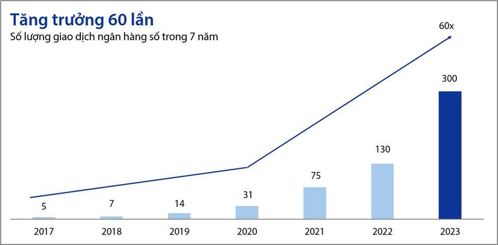 Hệ sinh thái ngân hàng số VIB tiếp tục mở rộng, cung cấp những sản phẩm và dịch vụ đa dạng phục vụ cho các nhu cầu sử dụng khác nhau của khách hàng, góp phần quan trọng giúp VIB tăng thêm 1 triệu khách hàng mới trong năm 2023. Số lượng giao dịch trên nền tảng số đạt hơn 300 triệu giao dịch, tăng hơn 130% so với năm 2022 và tăng 60 lần sau 7 năm, đưa tỷ lệ giao dịch qua kênh số chiếm đến 94% tổng lượng giao dịch bán lẻ.