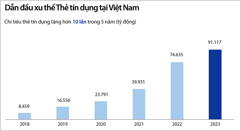 Trong năm 2023, với chiến lược Dẫn đầu xu thế thẻ, VIB tiếp tục cho ra mắt thị trường nhiều dòng thẻ mới với các tính năng sản phẩm vượt trội và lần đầu được giới thiệu tại Việt Nam. Sau 6 năm, tổng số thẻ tín dụng lưu hành đạt hơn 700.000 thẻ, tăng gấp 8 lần cùng chi tiêu của khách hàng qua thẻ tín dụng VIB tăng trưởng hơn 10 lần, đạt mốc tổng chi tiêu 4 tỷ đô la trong năm 2023, duy trì vị thế top đầu thị phần MasterCard tại Việt Nam.