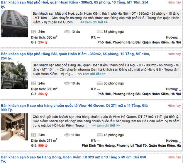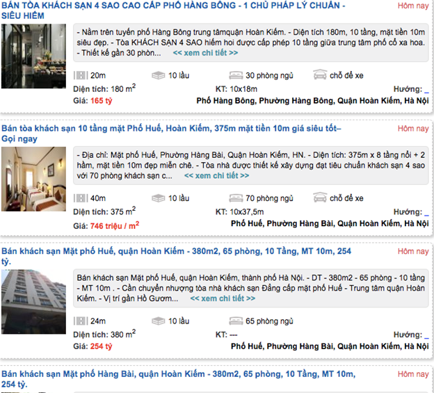 Ngoài ra, một số khách sạn trên phố Hàng Bài cũng rao bán giá 65 tỷ đồng. Diện tích đất khoảng 100 m2, mặt tiền 5,5 m. Trên phố Hàng Buồm, một khách sạn cuối năm 2020 rao bán 75 tỷ đồng, đến đầu năm 2021 chủ nhà chấp nhận hạ xuống 60 tỷ đồng, giảm đến 15 tỷ đồng mà vẫn chưa có giao dịch.