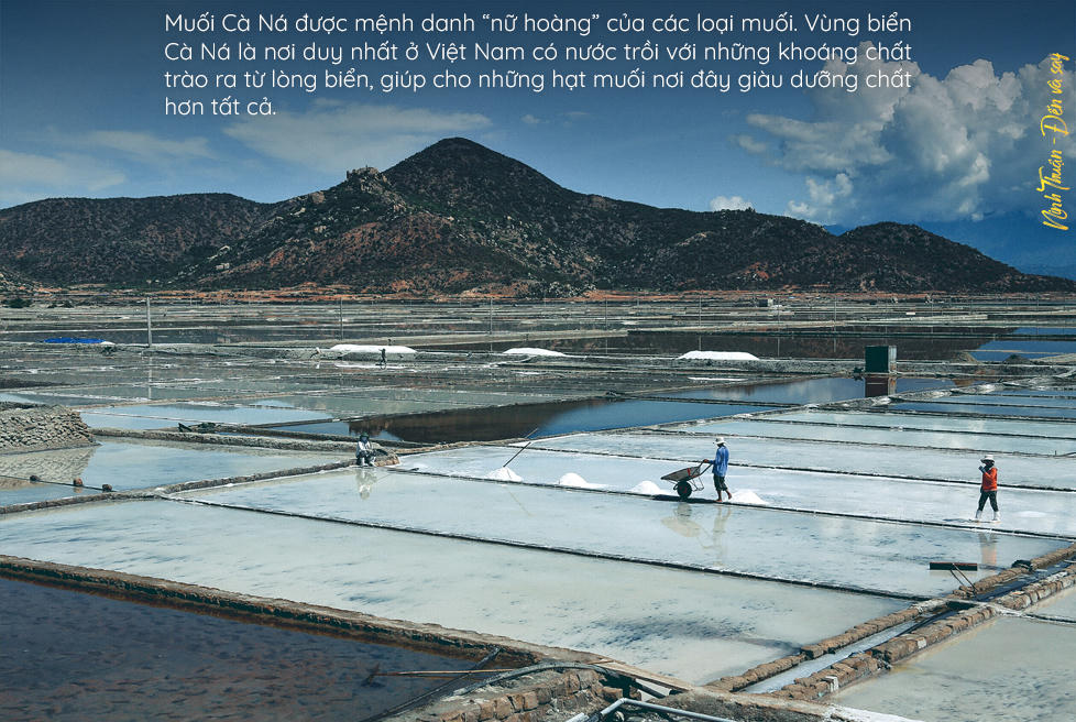 Cung đường biển dẫn đến “thiên đường” Cà Ná đẹp diễm lệ. Cỏ cây mang một màu xanh nhiệt đới, bờ biển dài bất tận, những khối đá xếp chồng lên đá. Điểm nhấn ở Cà Ná chính là cánh đồng muối - sáng lấp lánh như ánh sáng chói chang.