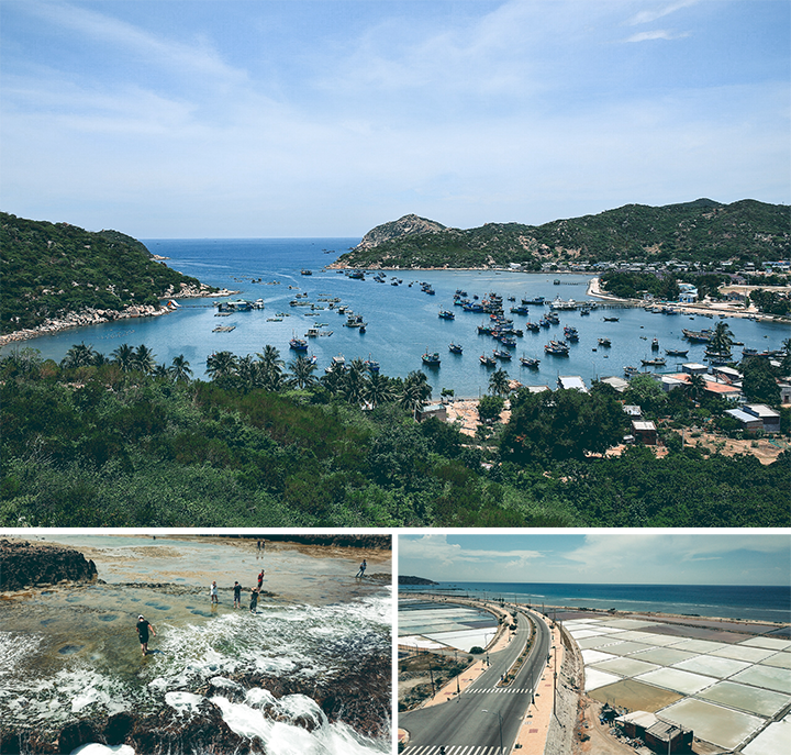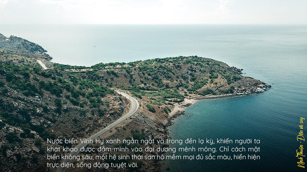 Từ Sân bay Quốc tế Cam Ranh thẳng đến Vĩnh Hy - vịnh biển nằm ở phía Bắc tỉnh Ninh Thuận, cung đường được mệnh danh là một trong những cung đường ven biển đẹp nhất Việt Nam với một bên núi non trùng điệp, một bên biển uốn lượn mềm mại như dải lụa vắt ngang sườn núi. Vĩnh Hy “nép mình” vào Núi Chúa - vườn quốc gia có độ cao hơn 1.000m từ mặt biển đến đỉnh núi cao nhất. Đứng trước Vĩnh Hy không ồn ã và vẹn nguyên hoang sơ, cảm giác bình yên thấm đẫm tâm hồn.