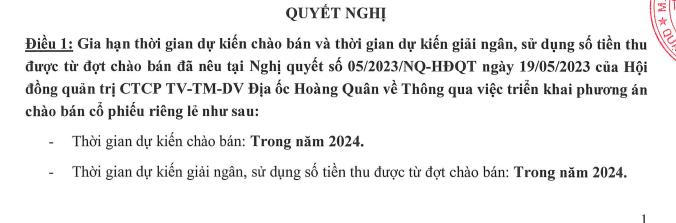 Theo đó, HQC gia hạn thời gian dự kiến chào bán, giải ngân và sử dụng số tiền thu được từ đợt chào bán sang năm 2024.