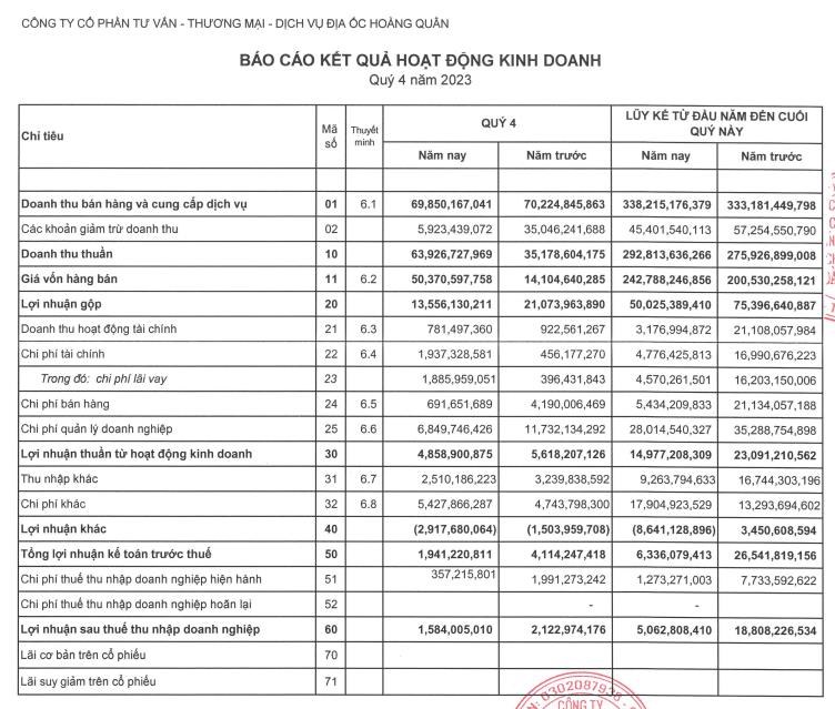 Kết quả là, Địa ốc Hoàng Quân báo lãi trước thuế 6,3 tỷ đồng, giảm 76% so với năm trước. Lãi sau thuế đạt 5,06 tỷ đồng, giảm 73% so với năm 2022.