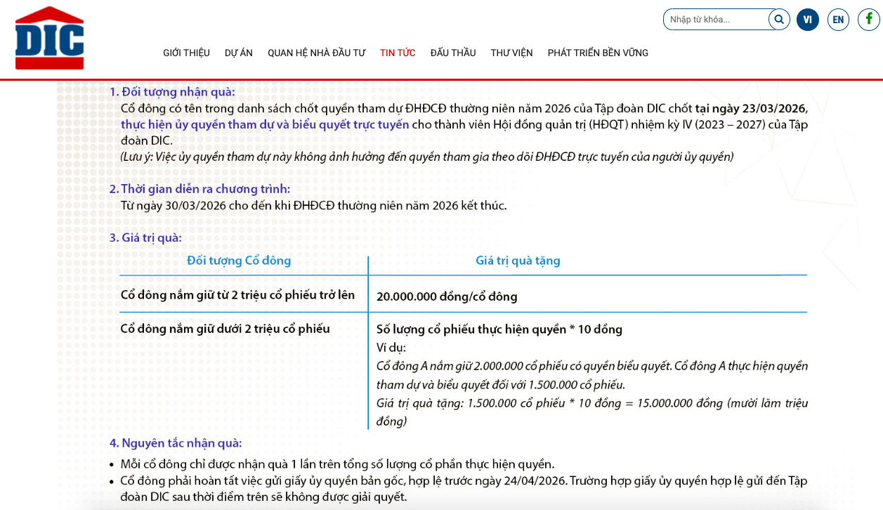Đối tượng nhận quà là các cổ đông có tên trong danh sách chốt quyền tham dự ĐHĐCĐ thường niên năm 2026 của DIC Group vào ngày 23/3 thực hiện ủy quyền tham dự và biểu quyết trực tuyến cho thành viên Hội đồng quản trị nhiệm kỳ IV (2023 - 2027).