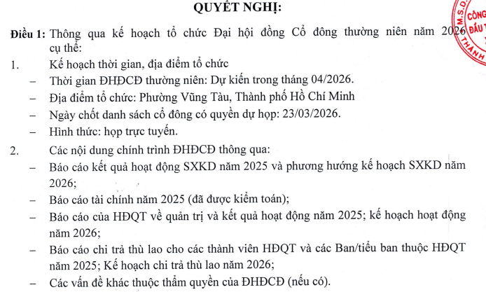 Theo đó, ngày chốt danh sách cổ đông có quyền dự họp ĐHĐCĐ thường niên năm 2026 DIC Corp là ngày 23/3/2026. Thời gian tổ chức dự kiến trong tháng 4/2026, tại phường Vũng Tàu (TP.HCM) theo hình thức họp trực tuyến.