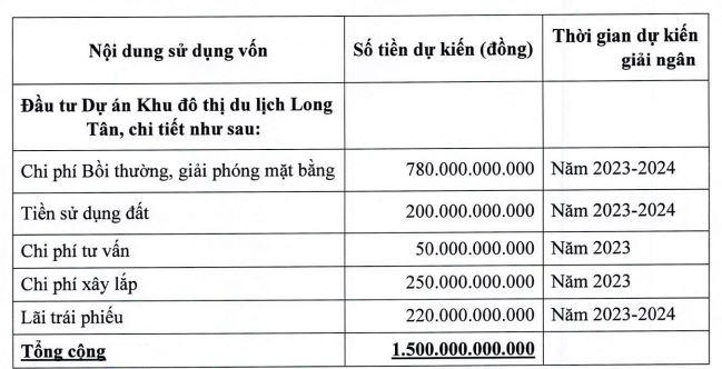Dự kiến, toàn bộ số vốn DIG thu được qua đợt phát hành này là 1.500 tỷ đồng được dùng để đầu tư vào Khu đô thị du lịch Long Tân.