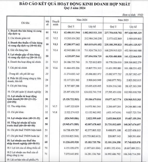 Về hoạt động kinh doanh, theo báo cáo kinh doanh hợp nhất, trong quý III/2024, DIC Corp ghi nhận doanh thu đạt 47,28 tỷ đồng, giảm 79,9% so với cùng kỳ. Nguyên nhân chính đến từ việc doanh thu kinh doanh bất động sản ghi nhận âm gần 65 tỷ đồng, trong đó hơn 15 tỷ đồng là hàng bán bị trả lại.