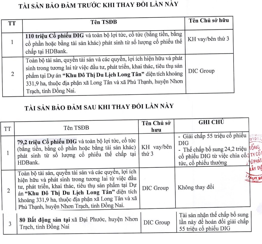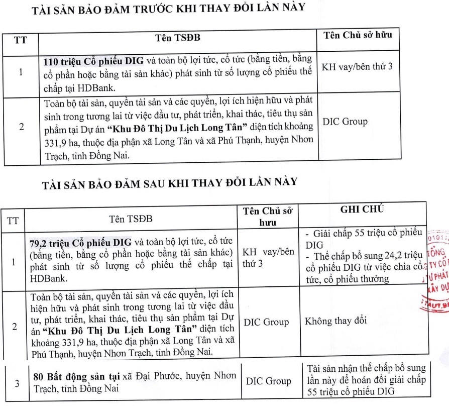 - Thay đổi 110 triệu cổ phiếu DIG và toàn bộ lợi tức, cổ tức phát hành từ số cổ phiếu thế chấp tại Ngân hàng thành 79,2 triệu cổ phiếu DIG và toàn bộ lợi tức, cổ tức phát hành từ số cổ phiếu thế chấp tại Ngân hàng, trong đó giải chấp 55 triệu cổ phiếu và thế chấp bổ sung 24,2 triệu cổ phiếu từ việc chia cổ tức và cổ tức thưởng.