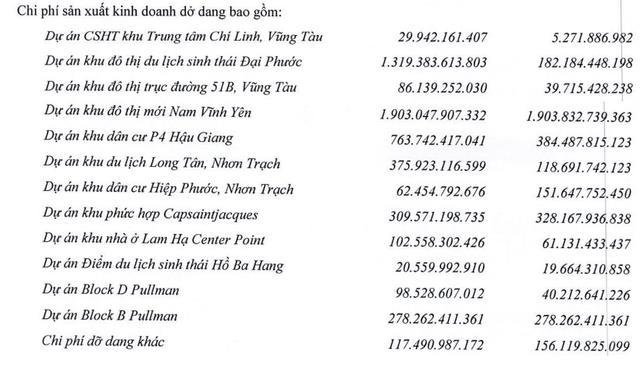 Tính đến 30/9/2022, tổng hàng tồn kho công ty còn gần 5.630 tỷ đồng, tăng mạnh 1.786 tỷ đồng so với thời điểm đầu năm, trong đó chi phí sản xuất kinh doanh dở dang tăng đột biến lên 5.467 tỷ đồng. Các khoản chi phí sản xuất kinh doanh dở dang ghi nhận tại hàng loạt dự án như KĐT DLST Đại Phước (1.319 tỷ, tăng 1.140 tỷ so với đầu năm ), Dự án CSHT khu trung tâm Chí Linh (Vũng Tàu), KĐT trục đường 51B (Vũng Tàu), KĐT mới Nam Vĩnh Yên, KDC P4 Hậu Giang…