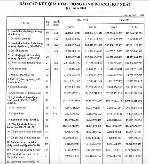 Về hoạt động kinh doanh, theo báo cáo kinh doanh hợp nhất, trong quý III/2024, DIC Corp ghi nhận doanh thu đạt 47,28 tỷ đồng, giảm 79,9% so với cùng kỳ.