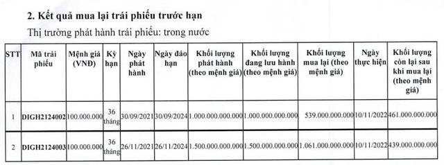 Cụ thể, ngày 10/11, DIC Corp hoàn tất mua lại 539 tỷ đồng trái phiếu trước hạn lô trái phiếu mã DIGH2124002, kỳ hạn 36 tháng, phát hành ngày 30/9/2021 và đáo hạn ngày 30/9/2024 với mệnh giá 1.000 tỷ đồng. Như vậy, khối lượng mã trái phiếu này hiện còn lại 461 tỷ đồng.