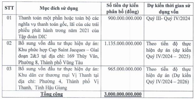 Số tiền huy động được theo phương án này dự kiến sẽ được sử dụng để thanh toán gốc, lãi trái phiếu đã được DIC Corp phát hành trong năm 2021 (900 tỷ đồng); bổ sung vốn đầu tư dự án khu phức hợp Cap Saint Jacques - giai đoạn 2 và 3 tại TP. Vũng Tàu (1.135 tỷ đồng); và bổ sung vốn đầu tư dự án Khu dân cư Vị Thanh tại TP Vị Thanh, Hậu Giang (965 tỷ đồng).