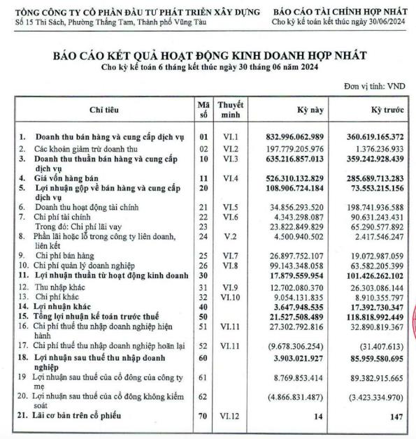 Về kết quả kinh doanh, theo báo cáo kinh doanh hợp nhất bán niên 2024, DIG ghi nhận doanh thu thuần đạt 635 tỷ đồng, tăng gấp 1,7 lần so với cùng kỳ năm ngoái.