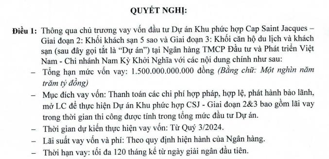 Tổng Công ty cổ phần Đầu tư Phát triển Xây dựng (DIC Group, mã ck: DIG) vừa công bố nghị quyết Hội đồng quản trị ngày 5/7/2024 thông qua chủ trương vay vốn đầu tư dự án Khu phức hợp Cap Saint Jacques - giai đoạn 2 (khối khách sạn 5 sao) và giai đoạn 3 (khối căn hộ du lịch và khách sạn) tại Ngân hàng TMCP Đầu tư và Phát triển Việt Nam.