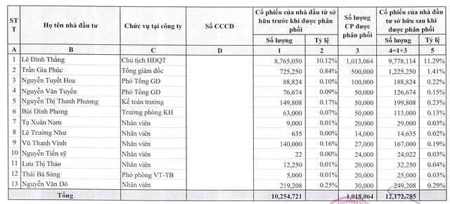 Danh sách các lãnh đạo và nhân viên tham gia mua cổ phiếu, bao gồm ông Lê Đình Thắng - Chủ tịch HĐQT DIC Holdings, mua số lượng lớn nhất với 1.013.064 cổ phiếu; ông Trần Gia Phúc - Tổng Giám đốc, mua 500.000 cổ phiếu; bà Nguyễn Tuyết Hoa - Phó Tổng Giám đốc, mua 100.000 cổ phiếu… và còn các lãnh đạo khác.