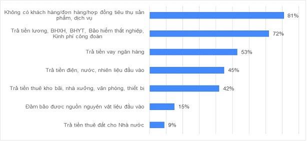 Kết quả khảo sát cho thấy, 20% doanh nghiệp số doanh nghiệp được khảo sát cho biết đã phải tạm dừng hoạt động. 76% doanh nghiệp không cân đối được thu chi, trong đó 54% doanh nghiệp có dòng tiền vào chỉ đáp ứng dưới 50% chi phí.